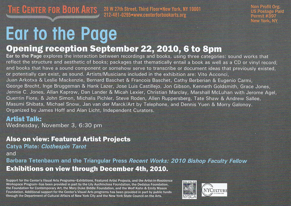 --------Ear to the Page --------co-curated with James Hoff --------Center for Book Arts, NYC --------September 22 - December 4 2010